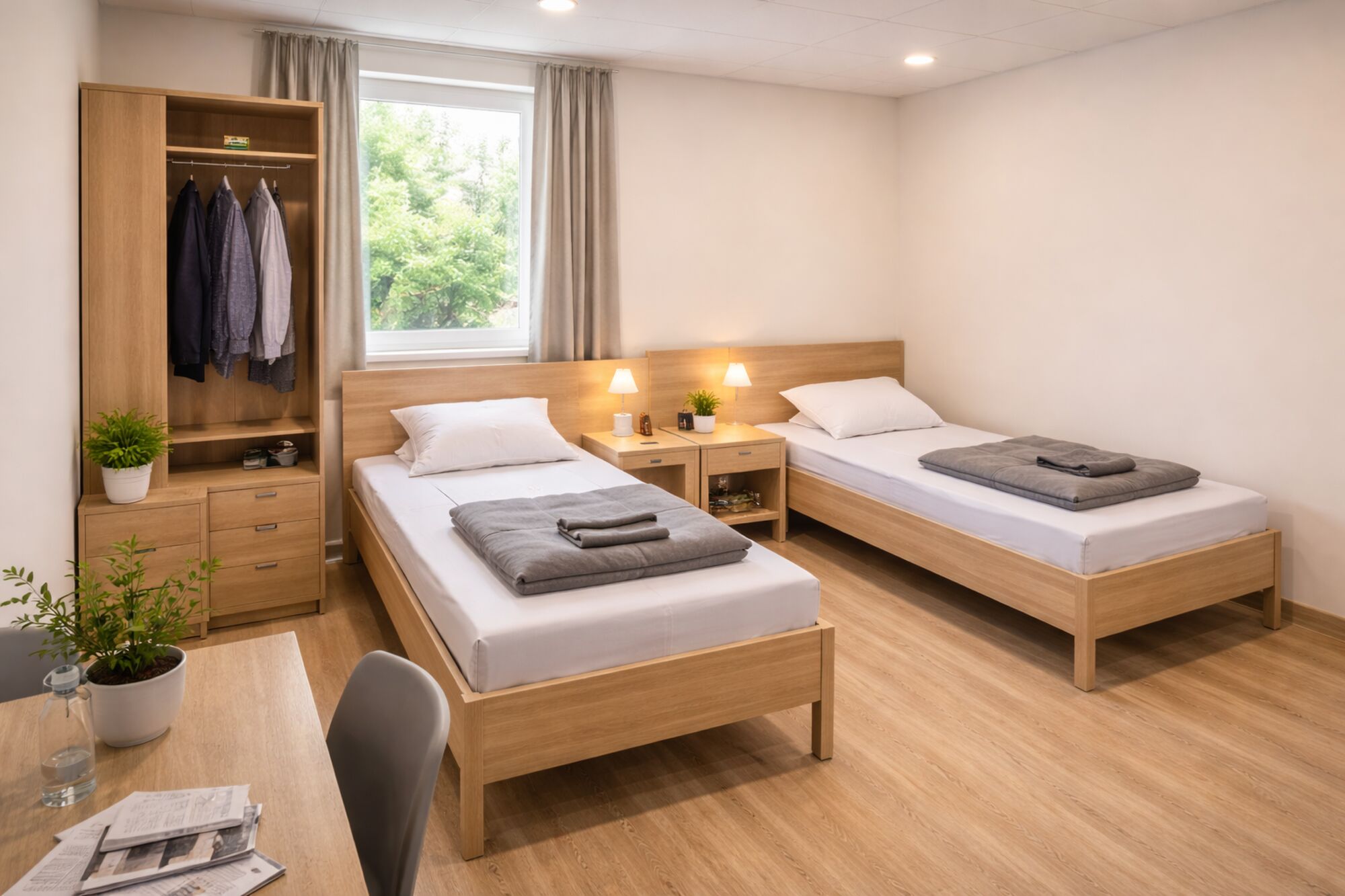 Unsere Zimmer und Unterkünfte - modern, gepflegt und komplett ausgestattet. Unsere Einzel- und Zweibettzimmer sind hell, freundlich und durchdacht eingerichtet: Bequeme Betten mit frischer Bettwäsche, geräumige Kleiderschränke für persönlichen Stauraum – teilweise abschließbar (auf Wunsch mit Safe), TV mit internationalen Programmen, Tische und Sitzgelegenheiten zum Arbeiten oder Entspannen, kostenfreies WLAN im gesamten Haus. Alle Zimmer werden regelmäßig gereinigt und entsprechen unseren hohen Hygiene- und Komfortstandards. Auf Wunsch erhalten Sie Handtücher gegen einen kleinen Aufpreis. Unsere großen Gemeinschaftsküchen sind vollständig ausgestattet mit Kochutensilien, Geschirr und Besteck, Kühlschrank, Mikrowelle und Herd, Kaffeemaschine und Wasserkocher.