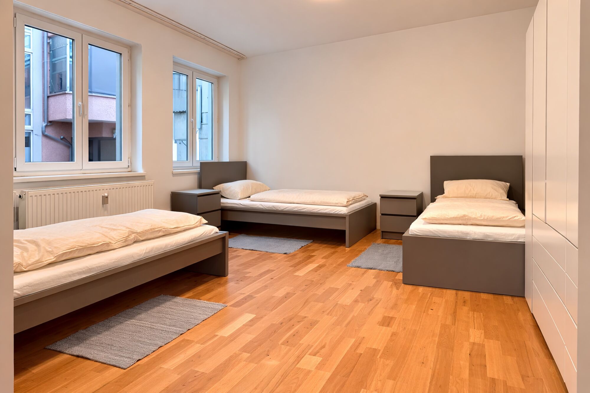 3 helle, separate Zimmer mit insgesamt 7 Einzelbetten, alle abschließbar